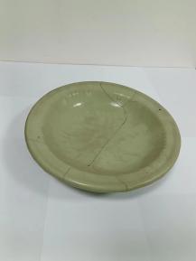 器体胎质灰白厚重,青绿色釉,釉色润泽晶莹,圈足内底施白釉。