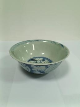 此器物完整,形制规整,胎质白且细密坚致,釉色泛青。碗内壁口沿处绘有上一下二组成青花三道弦纹,弦纹中间是网格纹和点组合的复合图案。